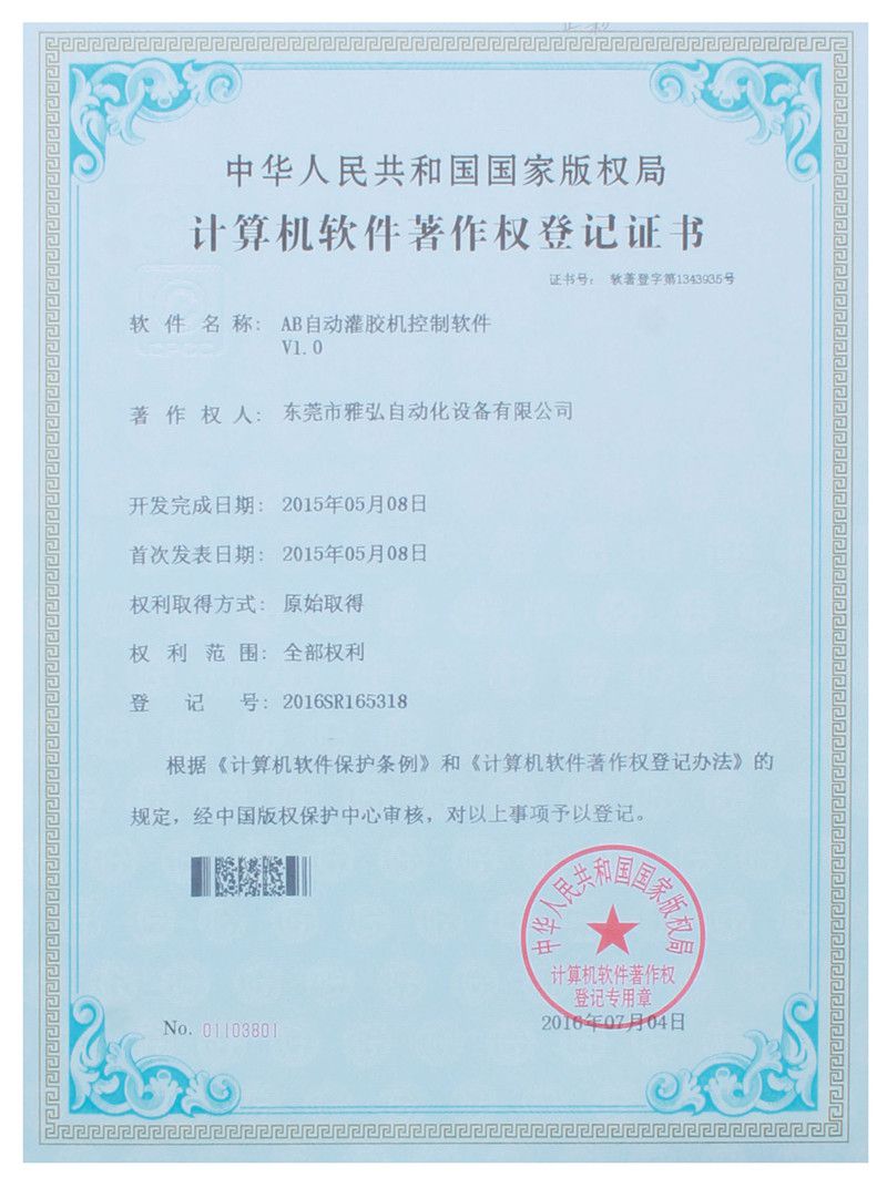 AB自動(dòng)灌膠機(jī)控制軟件證書(shū)